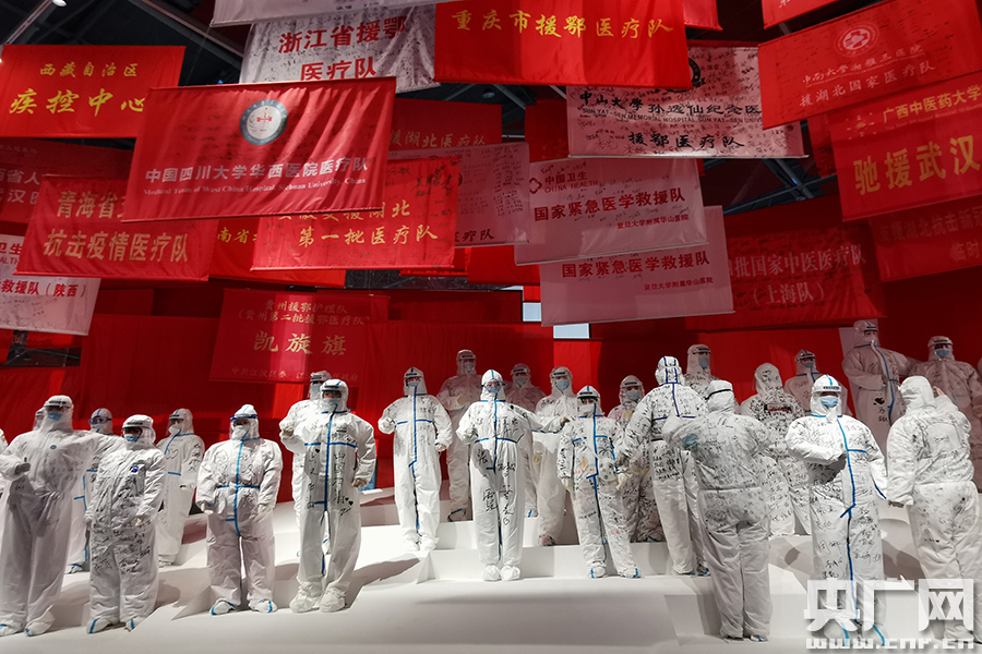 央廣網(wǎng)武漢10月15日消息(記者彭照)15日,“人民至上 生命至上——抗擊新冠肺炎疫情專題展覽”在武漢開展。近1.5公里的展線,1100余張照片,1000余件(套)實(shí)物展品,45個(gè)視頻作品等,生動(dòng)地再現(xiàn)了在最艱難的時(shí)刻,全國(guó)人民戮力同心抗擊疫情的部分情景。來自全國(guó)的援鄂醫(yī)療隊(duì)隊(duì)員代表、基層抗疫代表等受邀觀展。