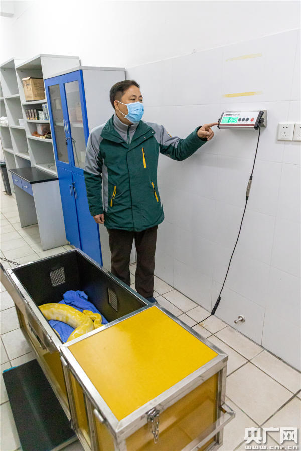 為了能準(zhǔn)確稱量黃金蟒的體重,保育員找來了大保溫箱上“秤盤”(央廣網(wǎng)發(fā) 通訊員供圖)