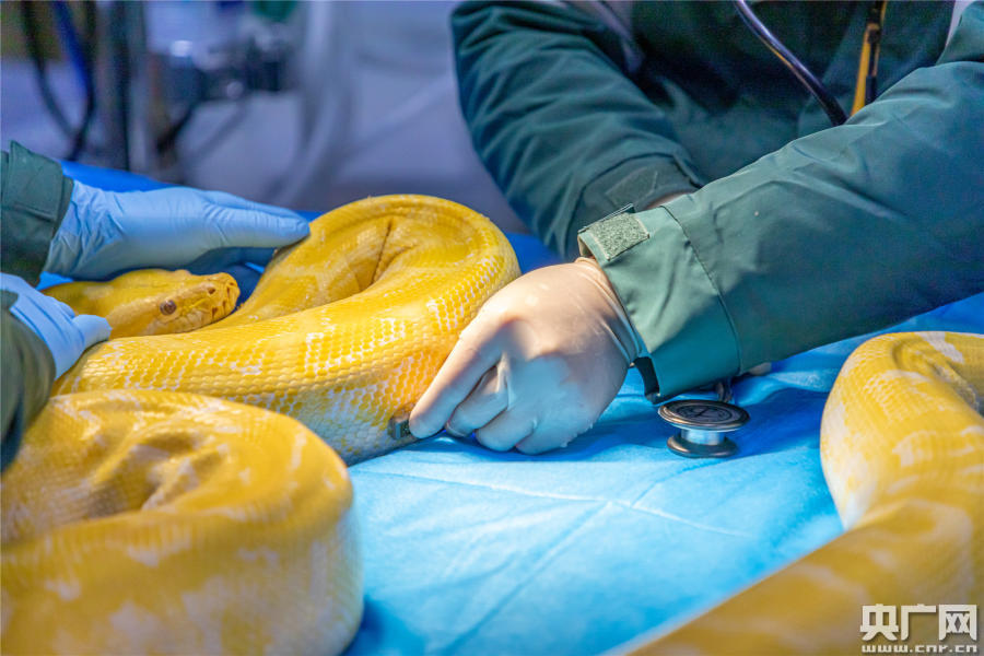 張?zhí)煊油ㄟ^聽診器,了解黃金蟒的心肺情況(央廣網(wǎng)發(fā) 通訊員供圖)
