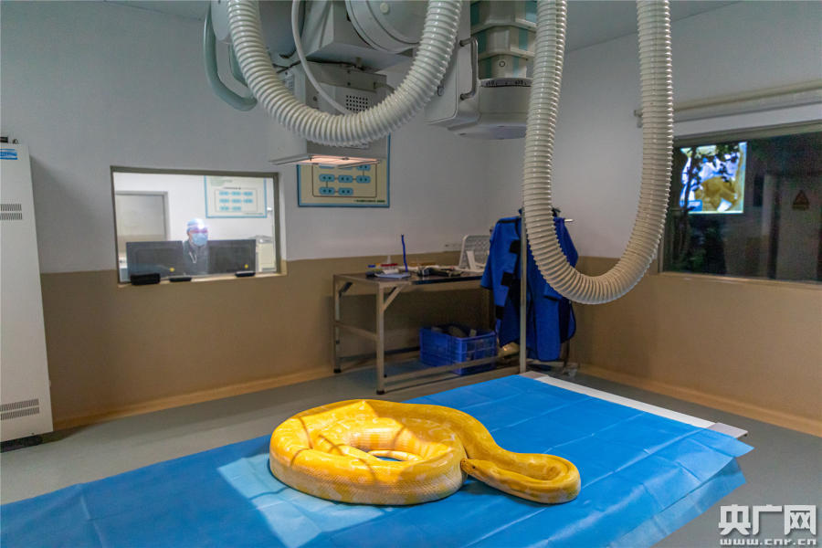 央廣網(wǎng)廣州12月21日消息(記者郭翔宇 通訊員鄧泳怡)生活在廣州長隆野生動(dòng)物園的黃金蟒嬌嬌,近日在該園的動(dòng)物醫(yī)院接受了年度體檢。為了減少對(duì)黃金蟒的影響,體檢的過程中,院長張?zhí)煊尤膛惆橹鴭蓩桑鴦?dòng)物醫(yī)院的獸醫(yī),也將整個(gè)流程控制在35分鐘。圖為獸醫(yī)在給嬌嬌進(jìn)行稱重。不同的動(dòng)物有不同的稱重方式,為了能準(zhǔn)確稱量黃金蟒的體重,保育員找來了大保溫箱上“秤盤”。