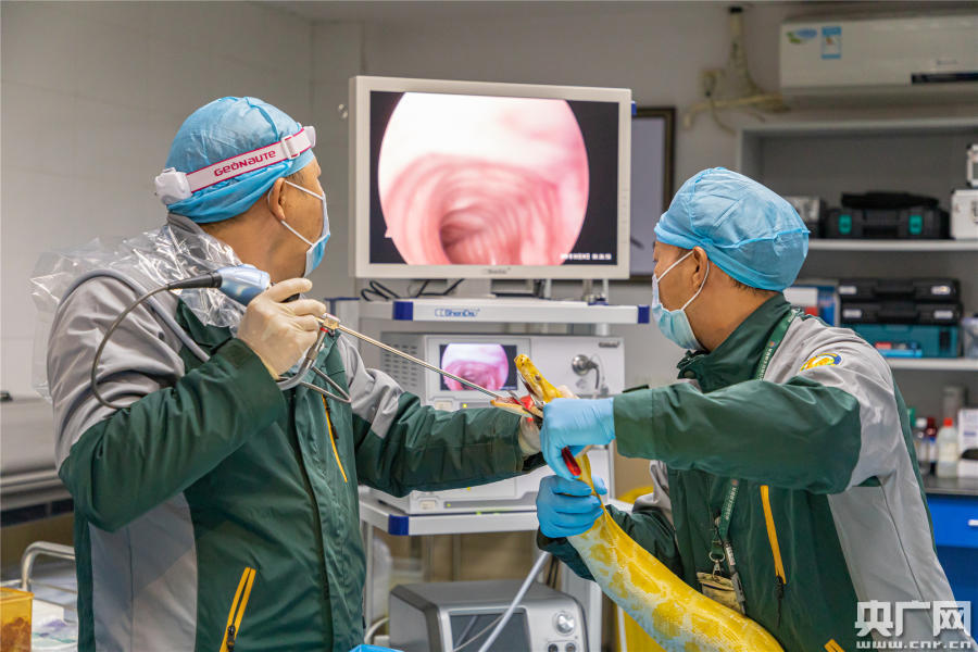 獸醫(yī)張?zhí)煊永脙?nèi)窺鏡對(duì)黃金蟒的氣管進(jìn)行檢查(央廣網(wǎng)發(fā) 通訊員供圖)