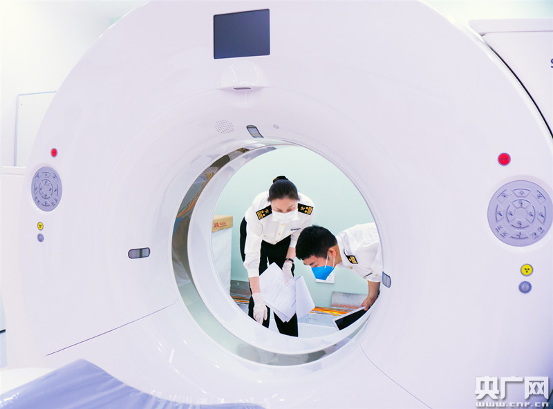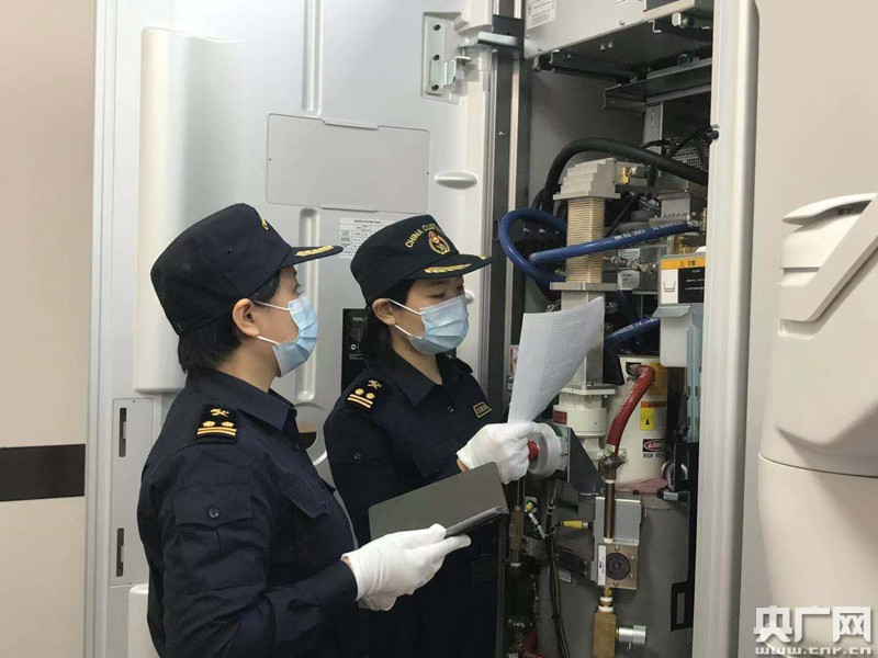 廣州海關(guān)所屬番禺海關(guān)關(guān)員對(duì)進(jìn)口醫(yī)用直線加速器進(jìn)行查驗(yàn)(央廣網(wǎng)發(fā) 陳俊鋒 攝)