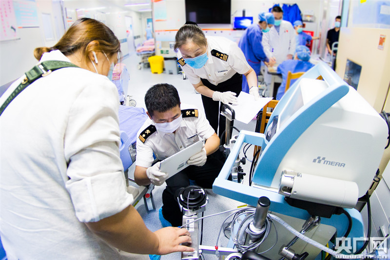 廣州海關(guān)所屬越秀海關(guān)關(guān)員對(duì)體外膜肺氧合設(shè)備進(jìn)行查驗(yàn)(央廣網(wǎng)發(fā) 方健明 攝)