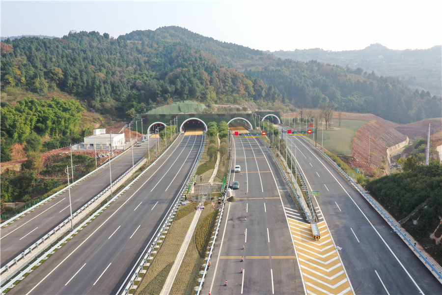 值得一提的是,成都天府國際機(jī)場高速公路龍泉山隧道采用的雙向十車道客貨分流四洞并行設(shè)計(jì)為全國首創(chuàng)。龍泉山隧道,全長4617m,隧道設(shè)計(jì)速度為120km/h,為分離式雙向四洞十車道。根據(jù)預(yù)測,將來新機(jī)場高速公路的車流量在10萬輛左右,由于進(jìn)隧道時車流量會下降5%左右,由此龍泉山隧道采用了雙向十車道設(shè)計(jì),比主線多兩條車道,設(shè)計(jì)時速120公里且客貨分流,貨車從兩側(cè)隧道通行、小車從中間隧道通行,互相不影響。龍泉山隧道照明采用無級調(diào)光技術(shù),根據(jù)車流量大數(shù)據(jù)和隧道內(nèi)外光照情況,適時無極調(diào)整洞內(nèi)LED燈照度;加密設(shè)置被動反光設(shè)施、增設(shè)全斷面反光環(huán),有效指引道路線形,改善洞內(nèi)照明,大大降低運(yùn)營期能源消耗。