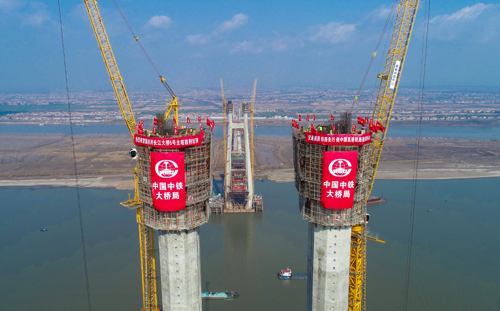 安九鐵路鳊魚洲長江大橋主橋首個主塔封頂(央廣網發(fā) 通訊員供圖)
