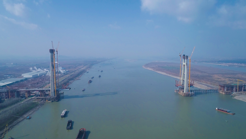 此次封頂的5號墩主塔位于九江側永安堤防護堤邊坡上,屬于H型結構,高達242米,相當于80層樓房高。建設者們采用液壓爬模分段施工,塔柱共41個節(jié)段,混凝土澆筑總方量為3.17萬立方米。