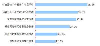 網(wǎng)民對(duì)于中央政府發(fā)起的各項(xiàng)網(wǎng)絡(luò)治理行動(dòng)總體表示關(guān)注,百度以“網(wǎng)絡(luò)治理”為關(guān)鍵詞的相關(guān)搜索結(jié)果有近50萬條,新浪微博相關(guān)貼文近350萬條。在高關(guān)注度下,網(wǎng)民對(duì)于互聯(lián)網(wǎng)治理行動(dòng)表示出高度支持。調(diào)查顯示,網(wǎng)民對(duì)6項(xiàng)網(wǎng)絡(luò)治理行動(dòng)的支持率均超過了90%。有4項(xiàng)治理行動(dòng)的支持度超過了95%。其中,98.4%的網(wǎng)民表示支持“打擊整治偽基站專項(xiàng)行動(dòng)”,96.7%的網(wǎng)民表示支持“掃黃打非.凈網(wǎng)2014專項(xiàng)行動(dòng)”,96.4%的網(wǎng)民表示支持“首屆國家網(wǎng)絡(luò)安全宣傳周”,95.2%的網(wǎng)民表示支持“規(guī)范網(wǎng)絡(luò)新聞信息傳播秩序?qū)m?xiàng)行動(dòng)”。
