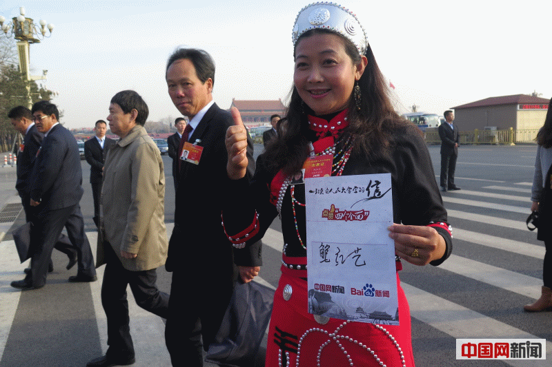 2015年3月12日,北京人民大會堂外,全國人大代表、云南省臨滄市滄源佤族自治縣國門小學數學教師鮑紅藝點贊“四個全面”。