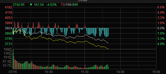 央廣網(wǎng)北京7月15日消息 股指下午再度跳水,滬指失守3800點(diǎn),跌幅超3%;深成指跌幅超3%;個(gè)股方面,兩市逾1700股下跌,近900股跌停。