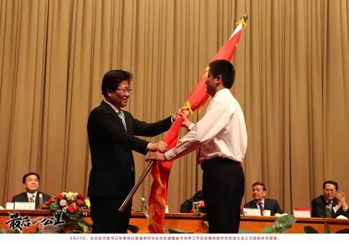 2011年3月24日,張春賢在普通高校畢業(yè)生赴援疆省市培養(yǎng)工作啟動大會上為首屆學員授旗