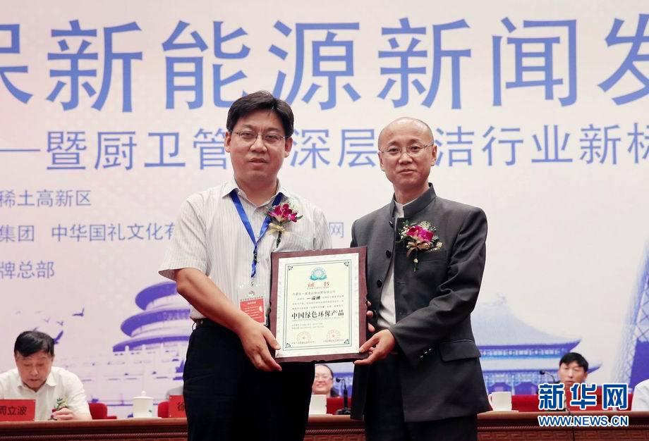 9月20日,廚衛(wèi)管道深層清潔行業(yè)高峰論壇暨環(huán)保新能源創(chuàng)新品牌“一灌通”新聞發(fā)布會(huì)在京舉行。圖為環(huán)保證書頒發(fā)儀式。新華網(wǎng)發(fā)(王 超 攝)