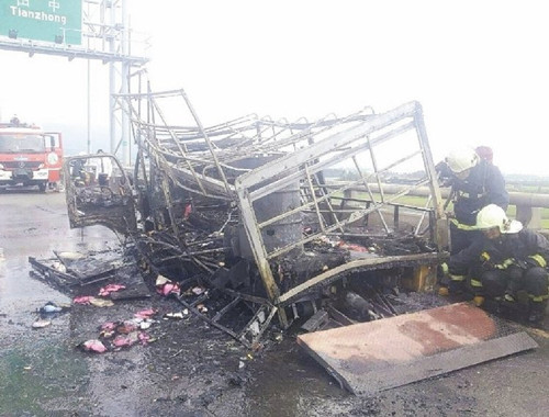 蕭男說,他行駛到八卦山隧道前的林厝交流道附近,從后視鏡驚見后車篷竄出熊熊火焰,他和助手沖下車,因車上沒有滅火設備,消防局到場迅速撲滅火勢,但整輛車仍在半小時被燒成骨架。
