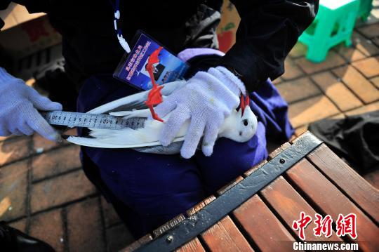 中新網(wǎng)昆明12月10日電(馬騫 楊謹(jǐn)語)“成鳥,體重282克,體長38.2厘米,喙長31.38毫米……”將這些信息一一記錄之后,工作人員還會在紅嘴鷗的腳上套上一個金屬腳環(huán)和一個藍(lán)色塑料腳環(huán)。10日,工作人員在昆明海埂大壩上一番忙碌,紅嘴鷗們便有了自己的“身份證”。