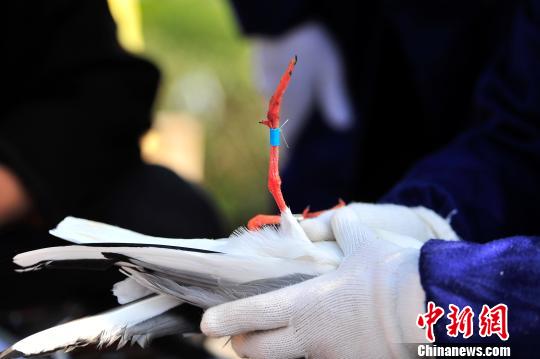 圖為工作人員為來昆明越冬的紅嘴鷗環(huán)志 劉冉陽 攝
