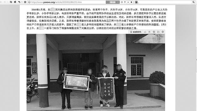 潁上縣政府網(wǎng)站上至今還掛著一篇表揚稿,其中包括已調(diào)任劉集派出所所長的陳西樓為村民朱某的兩個孫子更改戶口信息一事。