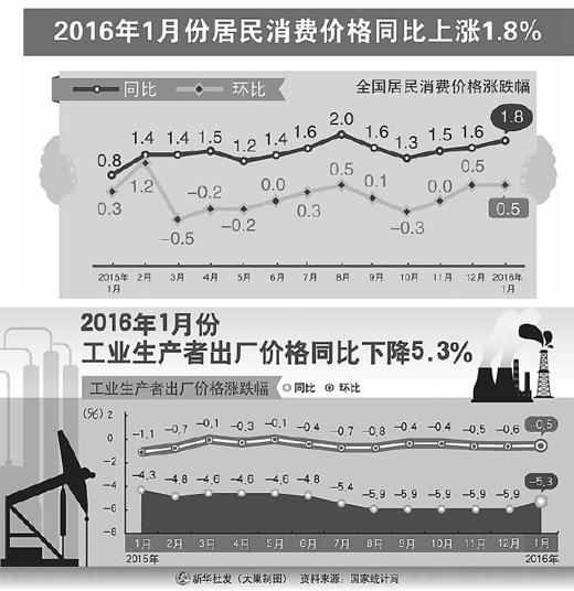 國(guó)家統(tǒng)計(jì)局2月18日發(fā)布的1月份全國(guó)居民消費(fèi)價(jià)格指數(shù)(CPI)和工業(yè)生產(chǎn)者出廠價(jià)格指數(shù)(PPI)數(shù)據(jù)顯示,CPI環(huán)比上漲0.5%,同比上漲1.8%,同比漲幅創(chuàng)下去年9月以來(lái)的新高;PPI環(huán)比下降0.5%,同比下降5.3%。盡管PPI連續(xù)47個(gè)月下滑,但環(huán)比、同比降幅雙收窄,釋放積極信號(hào)。