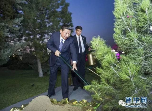 9月7日,習近平在訪問哈薩克斯坦期間,向哈薩克斯坦祖國保衛(wèi)者紀念碑獻花圈,在元首林種下一株象征友誼的杉樹。