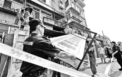 大井南里4號樓一樓臨街原本是圍欄,從去年開始,陸續(xù)有商戶將圍欄拆卸,私自搭建棚戶,逐漸成了違建底商一條街。開設(shè)的門店有經(jīng)營麻辣燙、包子的小餐廳,也有洗衣店、打印店等,給樓上及附近居民帶來了極大的噪音污染和環(huán)境污染。5月27日上午,豐臺區(qū)食藥監(jiān)局聯(lián)合盧溝橋街道辦事處、工商、城管、公安等部門,對這條街上的違建和無證無照商戶進行了統(tǒng)一查處。摘除25家違建無照無證商戶招牌,責令其清理營業(yè)場所。