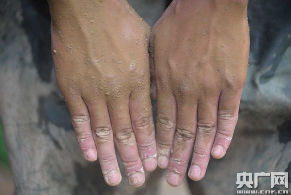 武警黃山支隊(duì)一名戰(zhàn)士的雙手。當(dāng)時(shí),他已連續(xù)奮戰(zhàn)12小時(shí),剛剛和戰(zhàn)友完成打樁工作,將沙袋加高到水平面以上。