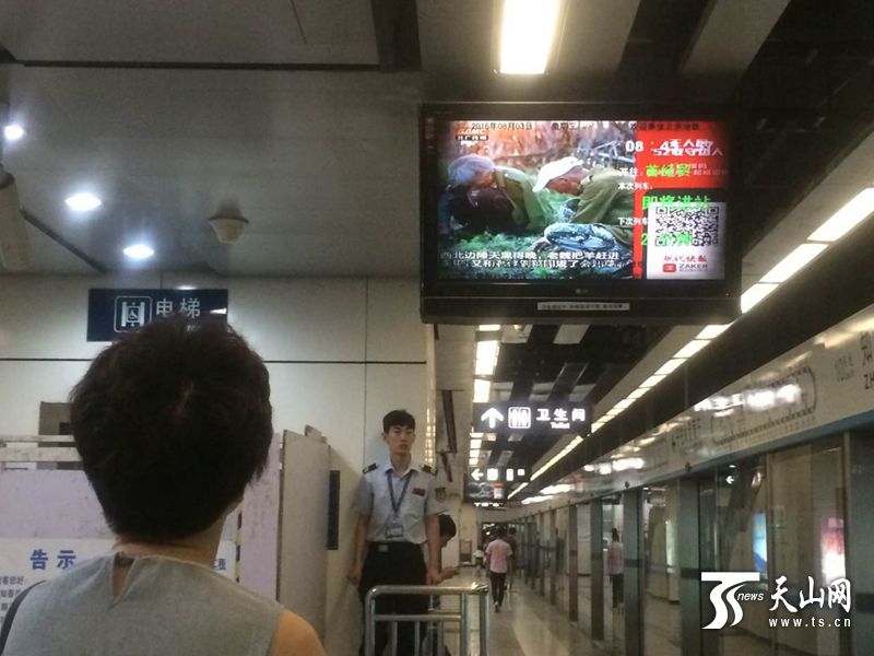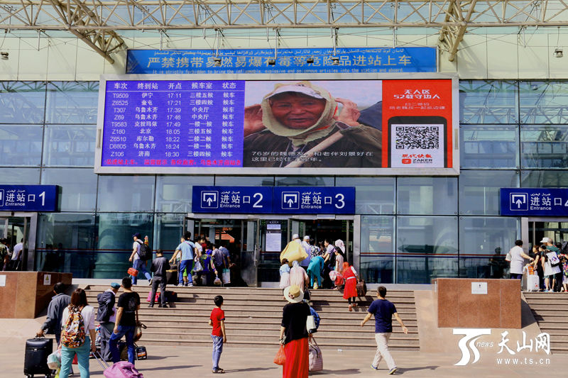 8月3日,烏魯木齊市火車南站站前廣場,大屏幕上正播放著《無人區(qū)·52載守邊人》公益短片。