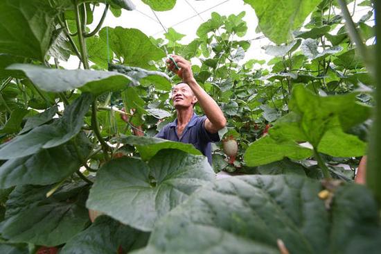 9月10日,寧化縣石壁鎮(zhèn)楊邊村貧困戶楊尤炳在福建石壁現(xiàn)代農(nóng)業(yè)有限公司“兩帶一扶”哈密瓜種植基地里勞作。近年來,福建省寧化縣依托寧化客家小吃、特色種養(yǎng)業(yè)等優(yōu)勢實施產(chǎn)業(yè)扶貧,開展創(chuàng)業(yè)就業(yè)培訓(xùn)、干部結(jié)對幫扶等推進(jìn)精準(zhǔn)扶貧,扶持貧困戶發(fā)展生產(chǎn)或優(yōu)先安排就業(yè),促進(jìn)貧困戶增收脫貧。新華社記者 林善傳 攝