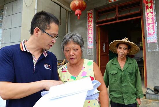 9月12日,古田縣紀(jì)委工作人員(左)在水口鎮(zhèn)灣邊村低保戶劉興龍家了解扶貧資金領(lǐng)取情況。近年來,福建省級扶貧開發(fā)重點縣古田縣紀(jì)委將查處扶貧領(lǐng)域違紀(jì)違規(guī)問題,作為整治侵害群眾利益的不正之風(fēng)和腐敗問題的重點工作,以“精準(zhǔn)監(jiān)督”為“精準(zhǔn)扶貧”保駕護(hù)航,努力杜絕扶貧領(lǐng)域虛報冒領(lǐng)、截留私分、揮霍浪費等問題發(fā)生。新華社記者魏培全攝