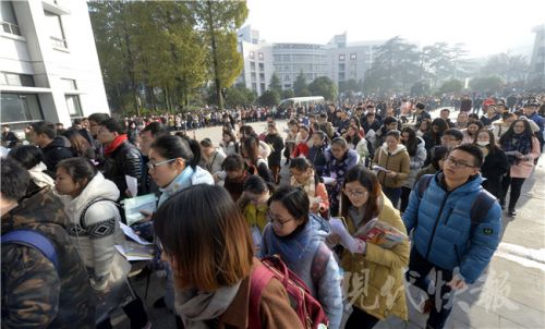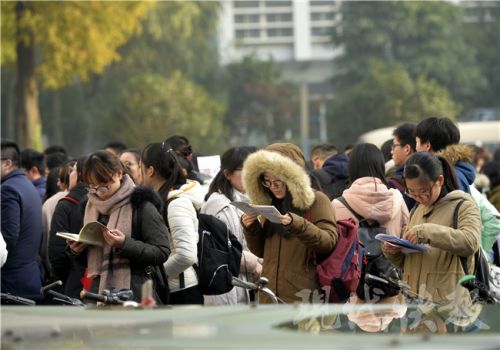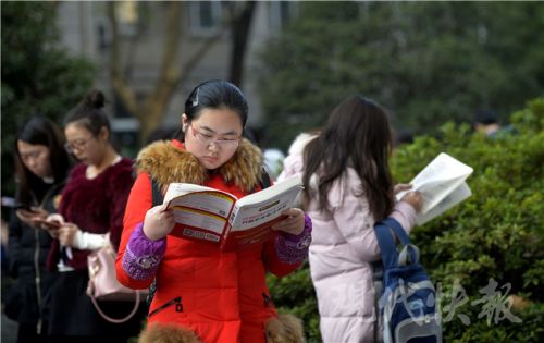 考生們進(jìn)場(chǎng)前還要“抱下佛腳”,不過考題的知識(shí)點(diǎn)跨度很大。新華報(bào)業(yè)視覺中心記者 邵丹 攝 2017國家公務(wù)員招錄筆試已正式開考,昨天是國考行測(cè)和申論考試的“大日子”,共有64124名考生選擇了江蘇考區(qū)參加國考。