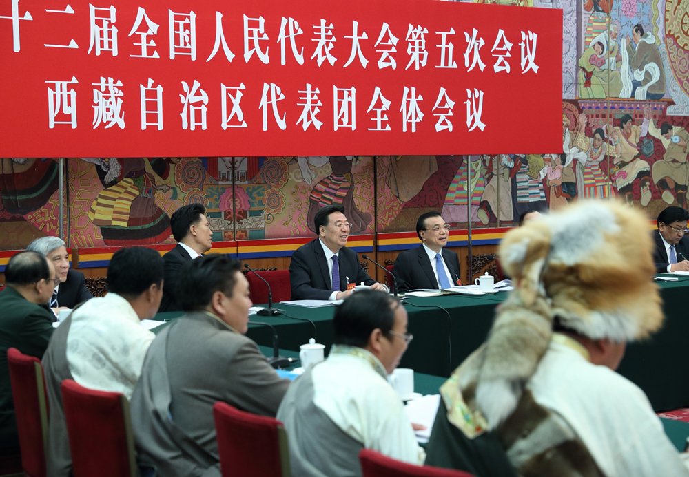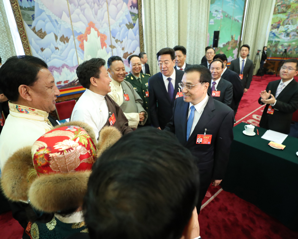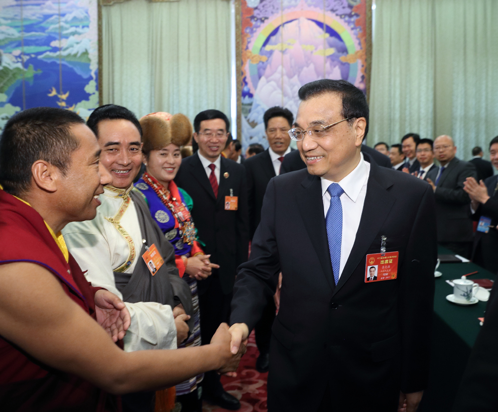 國(guó)際在線消息(記者 翟磊):李克強(qiáng)總理7日上午來(lái)到十二屆全國(guó)人大五次會(huì)議西藏代表團(tuán),參加審議政府工作報(bào)告。五位藏族、珞巴族、門巴族代表向總理獻(xiàn)上潔白的哈達(dá)。 -