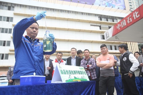 “您可以對(duì)比一下,油品摻入水雜,右邊使用除水濾芯后加注出的油樣照樣純凈透亮無(wú)雜質(zhì),而左邊的是用一般濾芯加注出的品樣,早已渾濁不堪。”現(xiàn)場(chǎng)解說(shuō)員候賢武向顧客耐心地演示著除水濾芯的神奇功效。演示過(guò)程中,現(xiàn)場(chǎng)使用模擬加油機(jī)加出注入大量的水油品,普通濾芯直接將含水油品加出來(lái),流速不減,加油槍仍然正常工作。但是安裝了除水濾芯的加油機(jī),遇到這種情況加油速度明顯變慢,直至濾芯內(nèi)遇水膨脹的材料完全將濾清器堵死,導(dǎo)致加油槍完全加不出油,以此向加油員發(fā)出警示:油品含水。這樣達(dá)到兩個(gè)目的,一是保證含水油不進(jìn)入消費(fèi)者油箱,二是萬(wàn)一加油站油罐含水,或者是設(shè)備設(shè)施的原因突然破壞性進(jìn)水,除水濾芯的反應(yīng)可以向加油站工作人員發(fā)出警報(bào)。目前,深圳石油所有加油站均安裝了能夠有效去除油品中的雜質(zhì)和隔離油品水份的高精度除水紙濾芯,確保清潔的油品加到消費(fèi)者的油箱,減少汽車發(fā)動(dòng)機(jī)的磨損,延長(zhǎng)車輛的使用壽命。該公司通過(guò)科技創(chuàng)新的方法把好了油品的最后一道關(guān),真正使消費(fèi)者用得安全、安心。