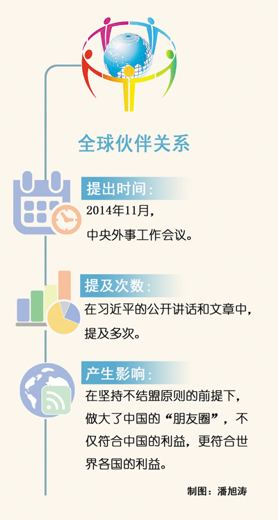 2014年11月底,習近平在中央外事工作會議上提出:要在堅持不結盟原則的前提下廣交朋友,形成遍布全球的伙伴關系網(wǎng)絡。