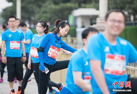 賽前跑友做準備活動 中新網(wǎng)記者 李卿 攝