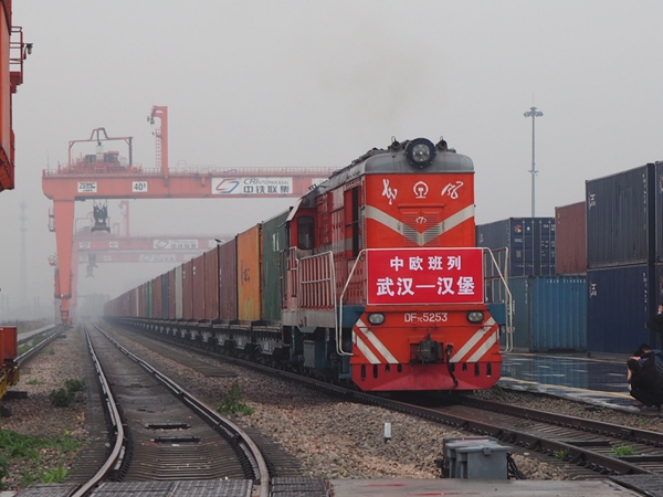 2017年4月16日武漢 編組50輛、滿(mǎn)載武漢及長(zhǎng)三角、珠三角企業(yè)生產(chǎn)的電子元器件、飲料、食品、機(jī)電產(chǎn)品的X8017/8次中歐班列(武漢—德國(guó)漢堡)從武漢鐵路局吳家山中心站安全開(kāi)出。