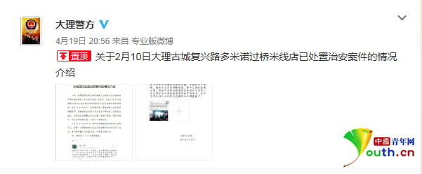 中國青年網(wǎng)北京4月20日電 (見習(xí)記者 劉利影) 4月19日,一則“大理古城復(fù)興路老板與游客發(fā)生肢體沖突”的視頻在微博上傳播。4月19日晚,大理市公安局通過官方微博發(fā)布情況通報(bào)稱,網(wǎng)傳視頻系2月10日大理古城米線店因糾紛引發(fā)治安案件的現(xiàn)場視頻,游客因食鹽味淡與店主發(fā)生口角后雙方扯打在一起,案件處理中雙方已和解并簽訂調(diào)解協(xié)議。