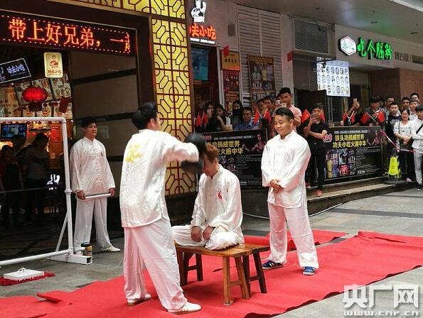 央廣網(wǎng)深圳4月29日消息(記者 于揚)在深圳真有鐵頭功!而且這位高手就藏在深圳的東門,他可以倒立在一根堅硬的鐵釘上數(shù)十分鐘,他就是鄭衛(wèi)勇。在之前香港舉行的“感恩杯”第十屆香港國際武術大賽上,他表演頭頂鐵釘?shù)沽,預計表演80分鐘,但第40分鐘時,裁判員已經(jīng)激動地宣布他獲得了冠軍!記者近日也用鏡頭紀錄了他令人咋舌的“功力”——倒立在一根堅硬的鐵釘上,頭部把釘在木板上的鐵釘壓彎!