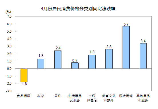 4月份,食品煙酒價(jià)格同比下降1.8%,影響CPI下降約0.56個(gè)百分點(diǎn)。其中,鮮菜價(jià)格下降21.6%,影響CPI下降約0.65個(gè)百分點(diǎn);蛋價(jià)格下降11.4%,影響CPI下降約0.07個(gè)百分點(diǎn);畜肉類(lèi)價(jià)格下降4.6%,影響CPI下降約0.23個(gè)百分點(diǎn)(豬肉價(jià)格下降8.1%,影響CPI下降約0.24個(gè)百分點(diǎn));水產(chǎn)品價(jià)格上漲5.9%,影響CPI上漲約0.11個(gè)百分點(diǎn);鮮果價(jià)格上漲5.9%,影響CPI上漲約0.10個(gè)百分點(diǎn);糧食價(jià)格上漲1.5%,影響CPI上漲約0.03個(gè)百分點(diǎn)。
