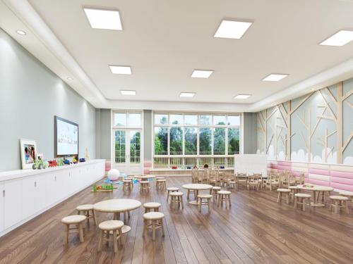 園內普通教室均有落地飄窗,保證通透采光,與近水走廊相連,課堂上能觀賞對岸風光;專項教室涵蓋閱覽、音樂、烹飪、美工、科學等各類課程,為孩子們營造充足的活動空間;戶外區(qū)域面積達二十多畝,以樟樹為主打造森林氛圍,其獨有的水塘能提供水生自然的學習資源,另設種植、養(yǎng)殖區(qū)塊,在天然的稻田中能與小動物相互親近。