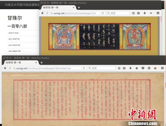 圖為1720年御制北京木刻版蒙古文《甘珠爾》經(jīng)的數(shù)字化成果,先登錄內(nèi)蒙古大學(xué)蒙古文數(shù)字圖書館即可查看!(nèi)蒙古大學(xué)圖書館 攝