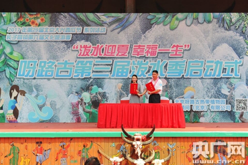 央廣網(wǎng)北京6月28日消息(記者雅萍)為推動全民健康感受自然和諧的生活方式,由北京呀路古熱帶植物園打造的第三屆“潑水迎夏,幸福一生”2017北京呀路古熱帶植物園潑水季活動于6月27日在位于大興區(qū)長子營鎮(zhèn)北京呀路古熱帶植物園內(nèi)正式啟動。北京市大興區(qū)旅游委主任顏淑敏、大興區(qū)團區(qū)委書記鄧靖力、北京市大興區(qū)長子營鎮(zhèn)黨委書記張輝、長子營鎮(zhèn)黨委副書記焦深海、中國熱帶農(nóng)業(yè)科學院香料飲料研究所所長唐冰等領導出席發(fā)布會現(xiàn)場。