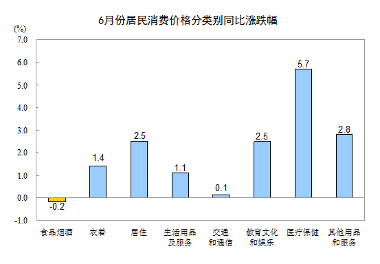 6月份,其他七大類價(jià)格同比均有所上漲。其中,醫(yī)療保健價(jià)格上漲5.7%,其他用品和服務(wù)價(jià)格上漲2.8%,居住、教育文化和娛樂價(jià)格均上漲2.5%,衣著、生活用品及服務(wù)、交通和通信價(jià)格分別上漲1.4%、1.1%和0.1%。
