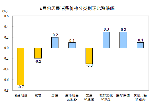 6月份,全國居民消費(fèi)價(jià)格環(huán)比下降0.2%。其中,城市下降0.1%,農(nóng)村下降0.2%;食品價(jià)格下降1.0%,非食品價(jià)格上漲0.1%;消費(fèi)品價(jià)格下降0.4%,服務(wù)價(jià)格上漲0.3%。