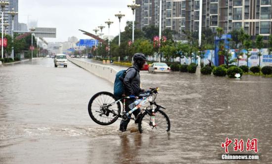 7月22日,民眾抬著自行車從積水路上走過。當(dāng)日,昆明持續(xù)降雨,城區(qū)多處路段積水。昆明市氣象臺發(fā)布暴雨藍(lán)色預(yù)警,未來12小時昆明市區(qū)及周邊多地區(qū)將持續(xù)降雨。 中新社記者 任東 攝