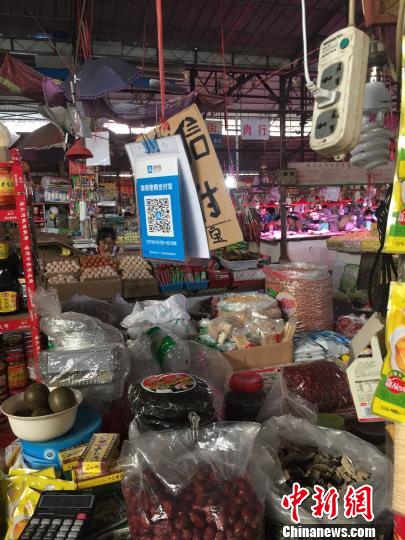 圖為燎源菜市的干貨攤位上方懸掛著收款二維碼!≈転t男 攝