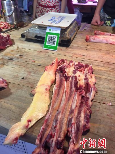 圖為燎源菜市的牛肉攤位張貼著收款二維碼!≈転t男 攝