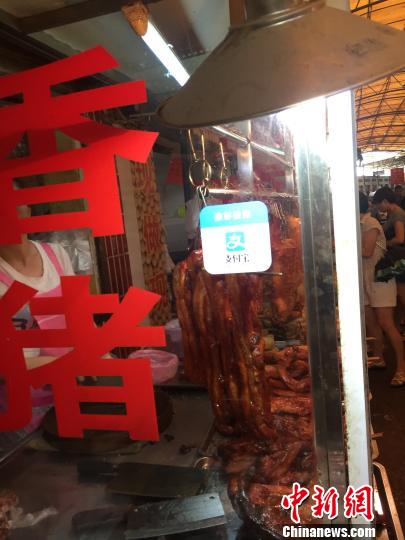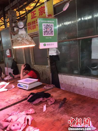 圖為燎源菜市的豬肉攤位上方懸掛著收款二維碼!≈転t男 攝