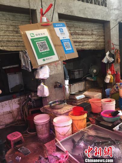 圖為燎源菜市的魚攤位上方懸掛著收款二維碼!≈転t男 攝