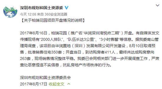 8月16日,柏瑞花園(推廣名“華潤深圳灣悅府二期”)開盤。有自媒體發(fā)文傳播現(xiàn)場有“2000人排隊”、“隊伍長達3公里”、“3小時售罄”等信息。據(jù)深圳市規(guī)劃和國土資源委員會南山管理局調(diào)查,該項目由華潤置地(深圳)發(fā)展有限公司開發(fā)建設(shè),8月10日取得預(yù)售,批準銷售住宅350套;開盤當日,到訪購房者411人,最終共達成購房意向263套,現(xiàn)場銷售情況整體平穩(wěn)。深圳市規(guī)劃和國土資源委員會已會同相關(guān)部門進一步開展調(diào)查工作,嚴肅查處惡意捏造不實信息,擾亂房地產(chǎn)市場秩序的行為。