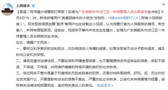 人民網(wǎng)北京9月12日電 (記者孝金波 實(shí)習(xí)生扶倩羽)9月8日,網(wǎng)民“奧黛麗赫本的小悲傷”發(fā)微博稱“云南建水城管打人”,并隨文附有視頻鏈接。當(dāng)日,中共建水縣委宣傳部通過官方微博表示,經(jīng)核實(shí),視頻所示實(shí)為廣東省韶關(guān)市湞江區(qū)一市場(chǎng)管理人員與菜販發(fā)生沖突的事件。