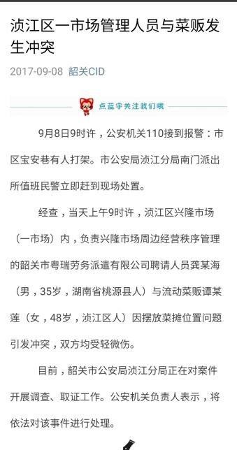 據(jù)韶關(guān)市公安局刑事警察支隊(duì)官方微信號(hào)9月8日發(fā)布的通報(bào),9月8日韶關(guān)公安機(jī)關(guān)“110”接到報(bào)警:市區(qū)寶安巷有人打架。韶關(guān)市公安局湞江分局南門派出所值班民警立即趕到現(xiàn)場(chǎng)處置。經(jīng)查,當(dāng)天上午9時(shí)許,湞江區(qū)興隆市場(chǎng)(一市場(chǎng))內(nèi),負(fù)責(zé)興隆市場(chǎng)周邊經(jīng)營(yíng)秩序管理的韶關(guān)市粵瑞勞務(wù)派遣有限公司聘請(qǐng)人員龔某海(男,35歲,湖南省桃源縣人)與流動(dòng)菜販譚某蓮(女,48歲,湞江區(qū)人)因擺放菜攤位置問題引發(fā)沖突,雙方均受輕微傷。