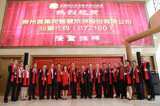 2017年9月13日,貴州黃果樹智慧旅游股份有限公司(以下簡稱智慧旅游公司)在全國中小企業(yè)股份轉(zhuǎn)讓系統(tǒng)舉行了新三板掛牌敲鐘儀式(證券簡稱:智慧旅游,股票代碼:872160)。 中共安順市委常委、市委副書記朱桂云,中共安順市委常委、安順市人民政府副市長文洪武,中共安順市委副秘書長宋春雨,安順市金融辦主任曹瑋,貴州黃果樹旅游集團股份有限公司董事長吳聲洪、總經(jīng)理王金源、副總經(jīng)理周若鵬,貴州黃果樹智慧旅游股份有限公司董事長張目及其他股東代表共同出席了智慧旅游公司的掛牌敲鐘儀式,見證了這一重要時刻。