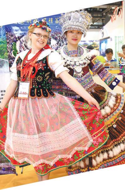 在2017北京國際旅游博覽會上,來自波蘭的安娜(左)和來自廣西柳州市融水苗族自治縣的張鳳媚合影留念。